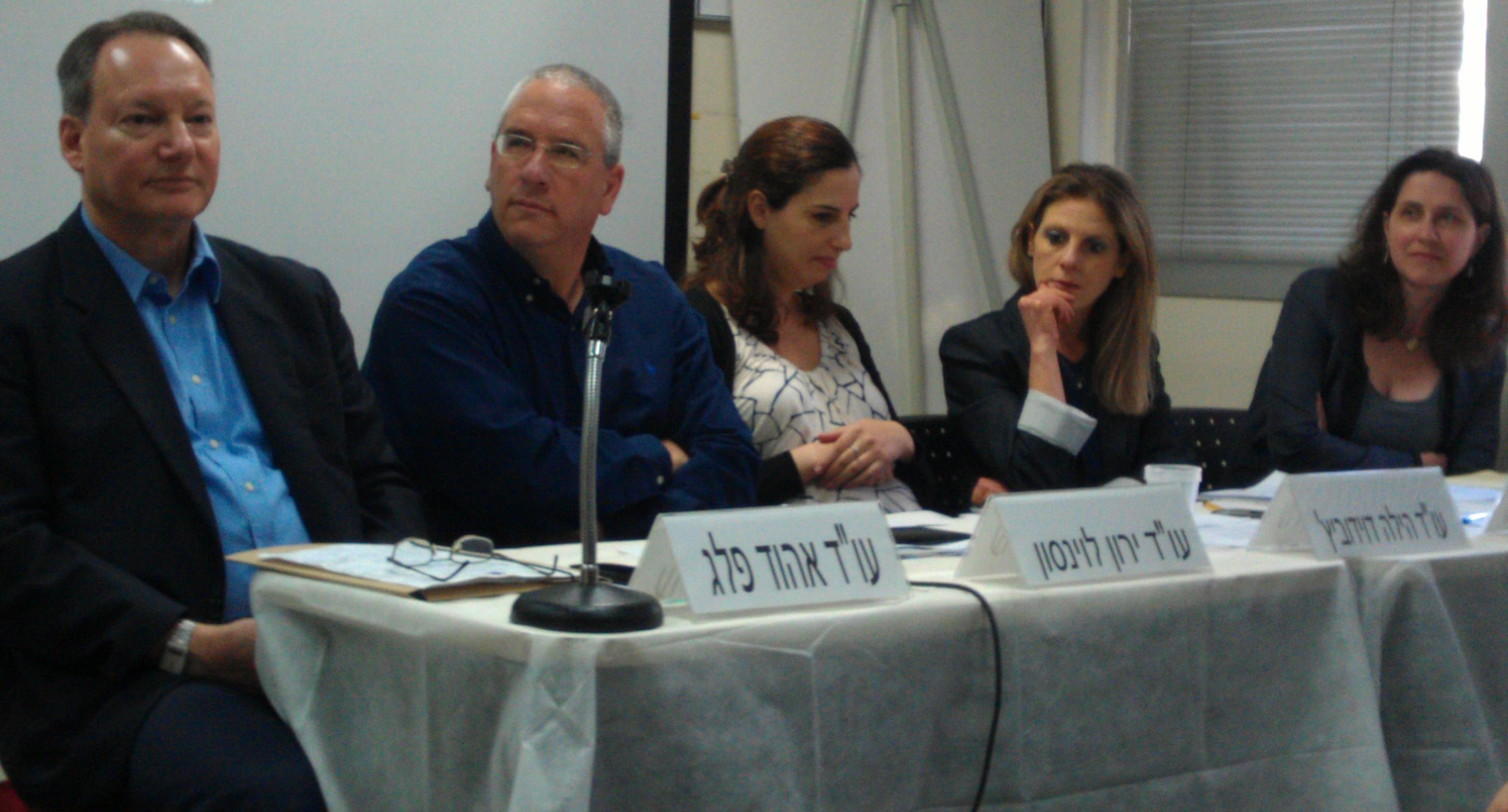 משתתפי פאנל בכנס. מימין לשמאל: עו"ד שוש רבינוביץ, מנהלת הלשכה המשפטית באיגוד לשכות המסחר; עו"ד רונית פרל, מנהלת רגולציה וקשרי ממשל במשרד עמית פולק מטלפון ושות' מטעם התאחדות התעשיינים; עו"ד הילה דוידוביץ', מחלקת יעוץ וחקיקה במשרד המשפטים; עו"ד ירון לוינסון, מנכ"ל רשות ההסתדרות לצרכנות; עו"ד אהוד פלג, מנכ"ל המועצה הישראלית לצרכנות