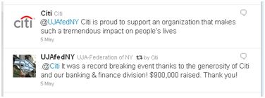 מעניין... בעת כתיבת הפוסט הזה, שיטוט קטן בדף הטוויטר של החברה, מצאתי ציוץ של המגבית היהודית – פדרצית ניו יורק, שהודתה ל citi על אירוע התרמה בו נתרמו לפדרציה 900,000$; בתגובה, צייץ הבנק כי הוא גאה לתמוך בארגון המשפיע לטובה על חייהם של אנשים כה רבים. 4,000 איש עוקבים אחר הציוצים של citi.